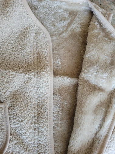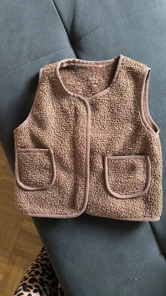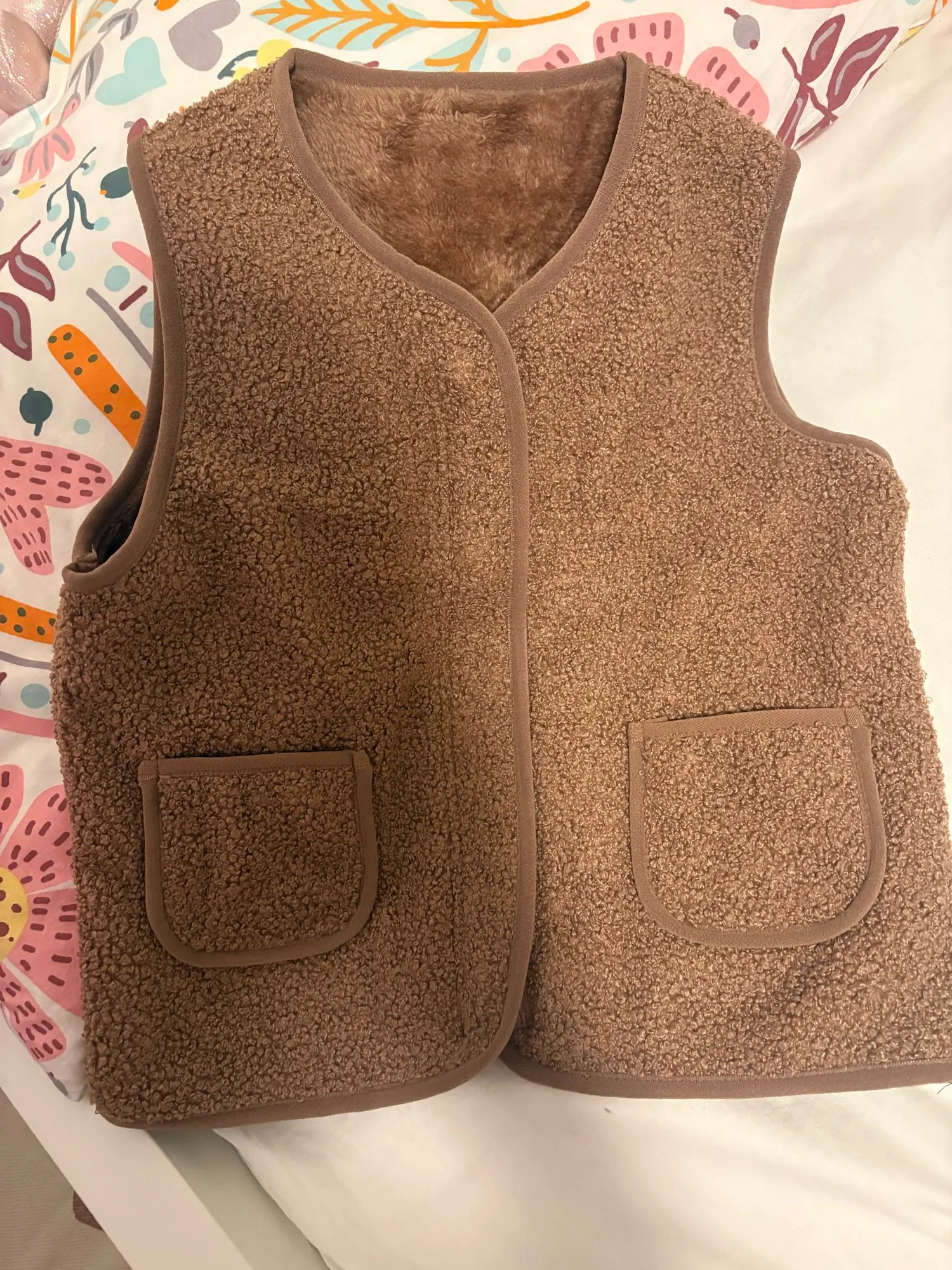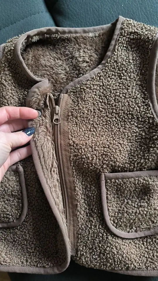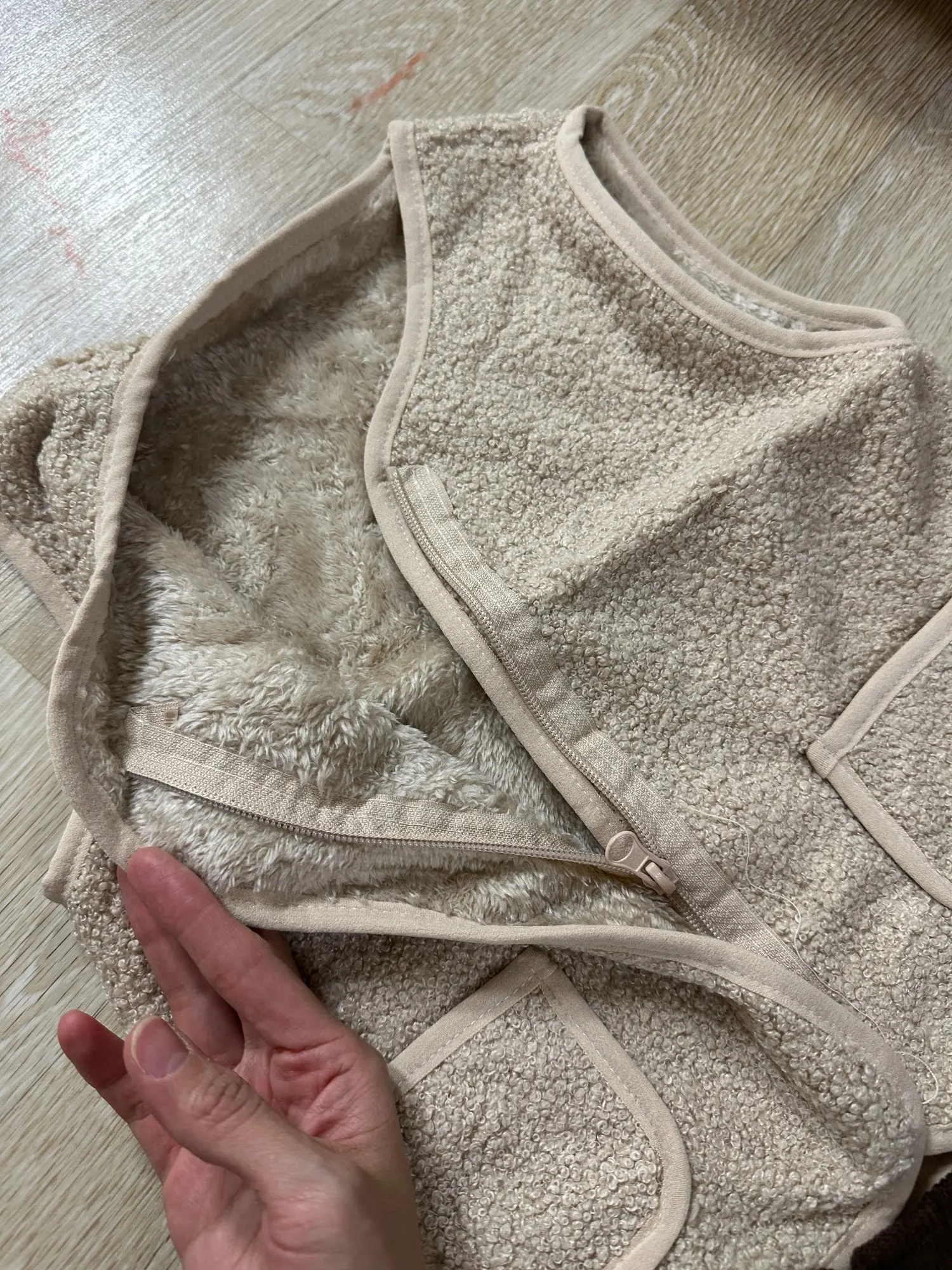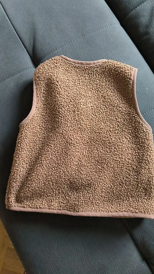 Most children’s vests at this price point use a single fabric throughout, or pair a decorative outer with a thin satin or polyester lining. This vest takes a noticeably different approach by using two completely different pile fabrics: the curly sherpa outer for texture and windbreak insulation, and the deep plush inner for direct skin warmth.