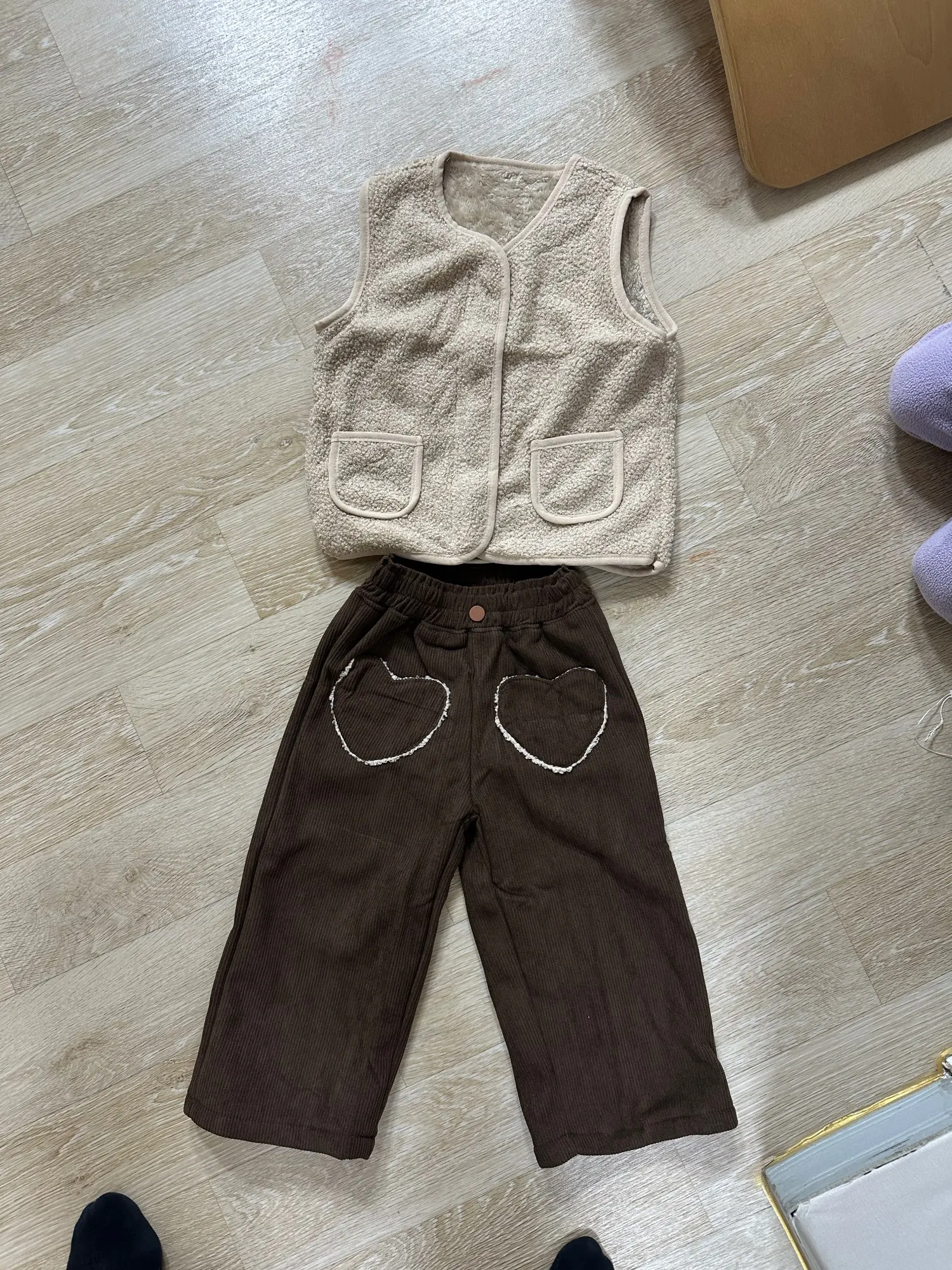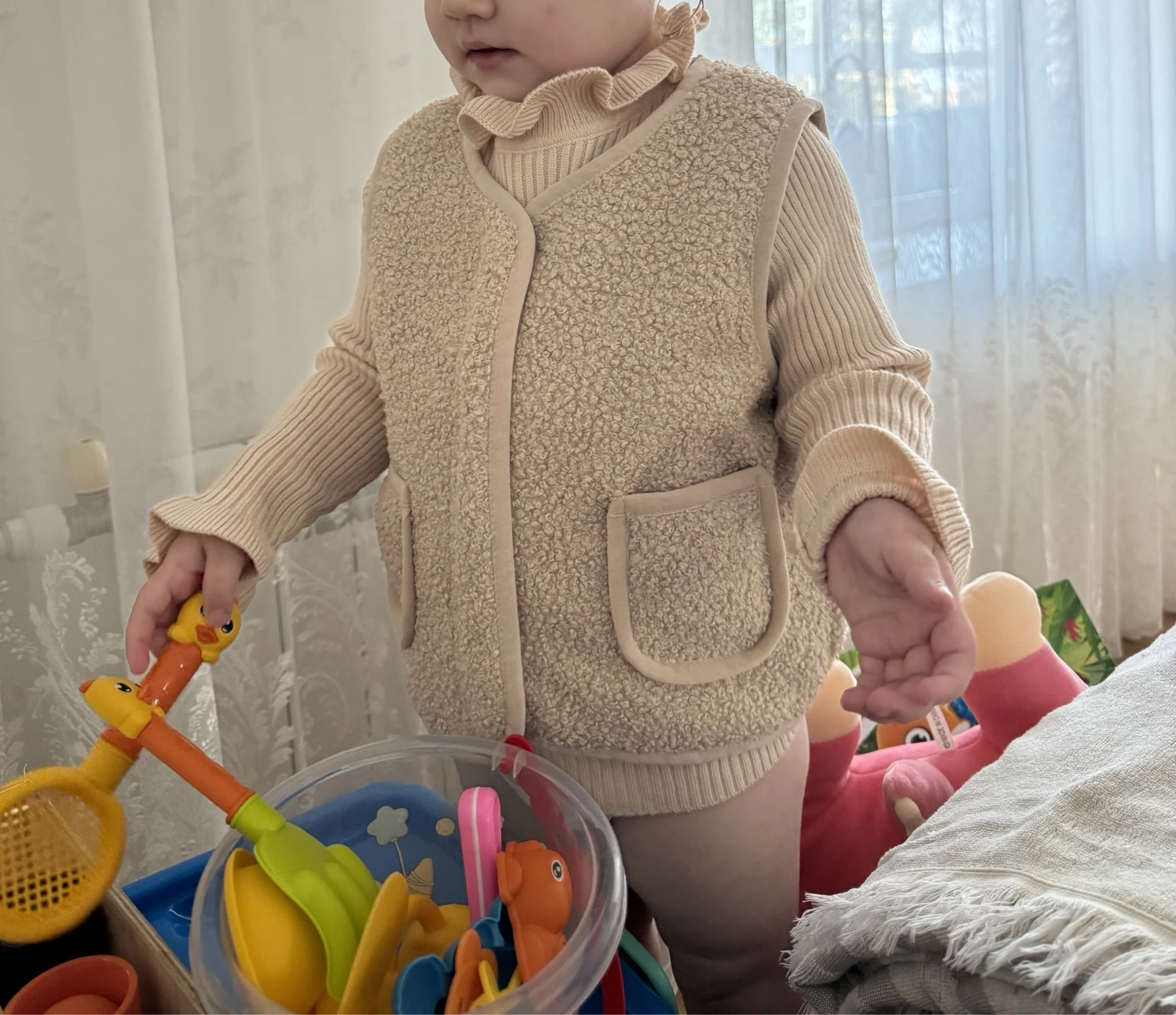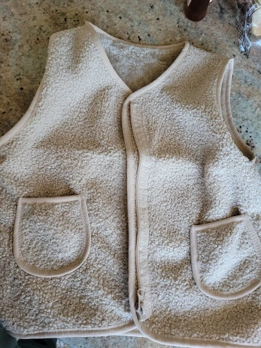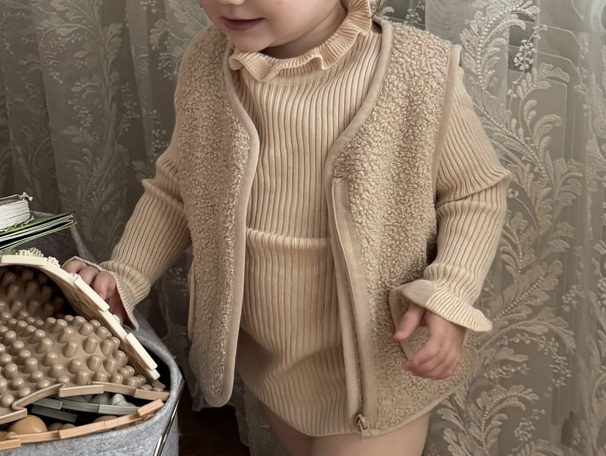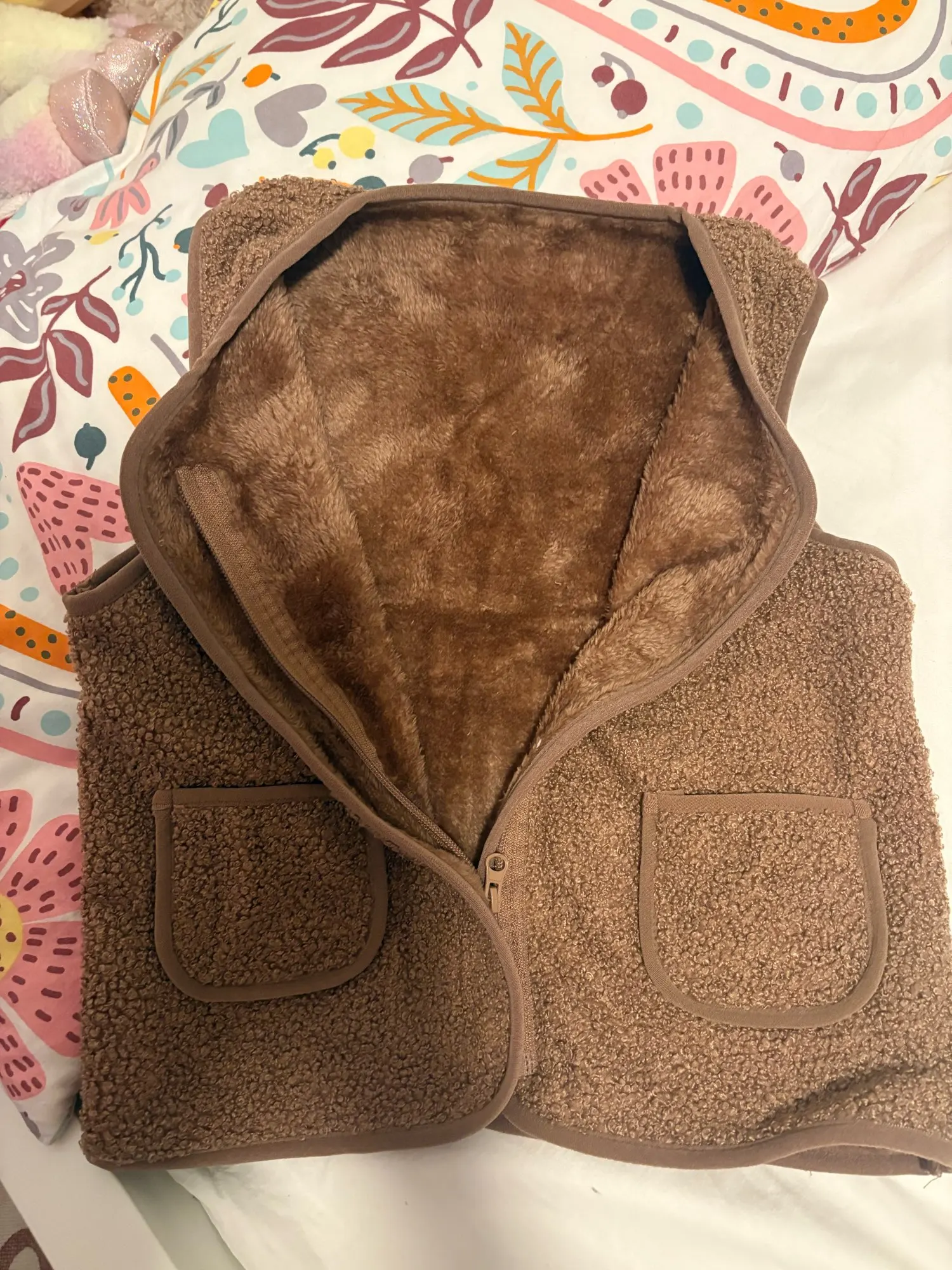 Most children’s vests at this price point use a single fabric throughout, or pair a decorative outer with a thin satin or polyester lining. This vest takes a noticeably different approach by using two completely different pile fabrics: the curly sherpa outer for texture and windbreak insulation, and the deep plush inner for direct skin warmth.