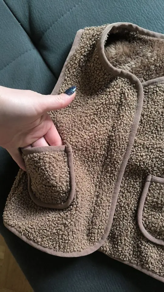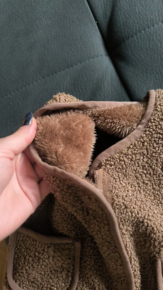 What sets this vest apart from a standard faux fur layering piece is the double-sided construction. The outside is a curly, bouclé-style sherpa fleece with a soft, tactile texture that looks as good as it feels. The inside is lined with a completely different fabric: a deep, silky-soft plush faux fur that sits against the skin and traps warmth with much more effectiveness than a standard satin lining.