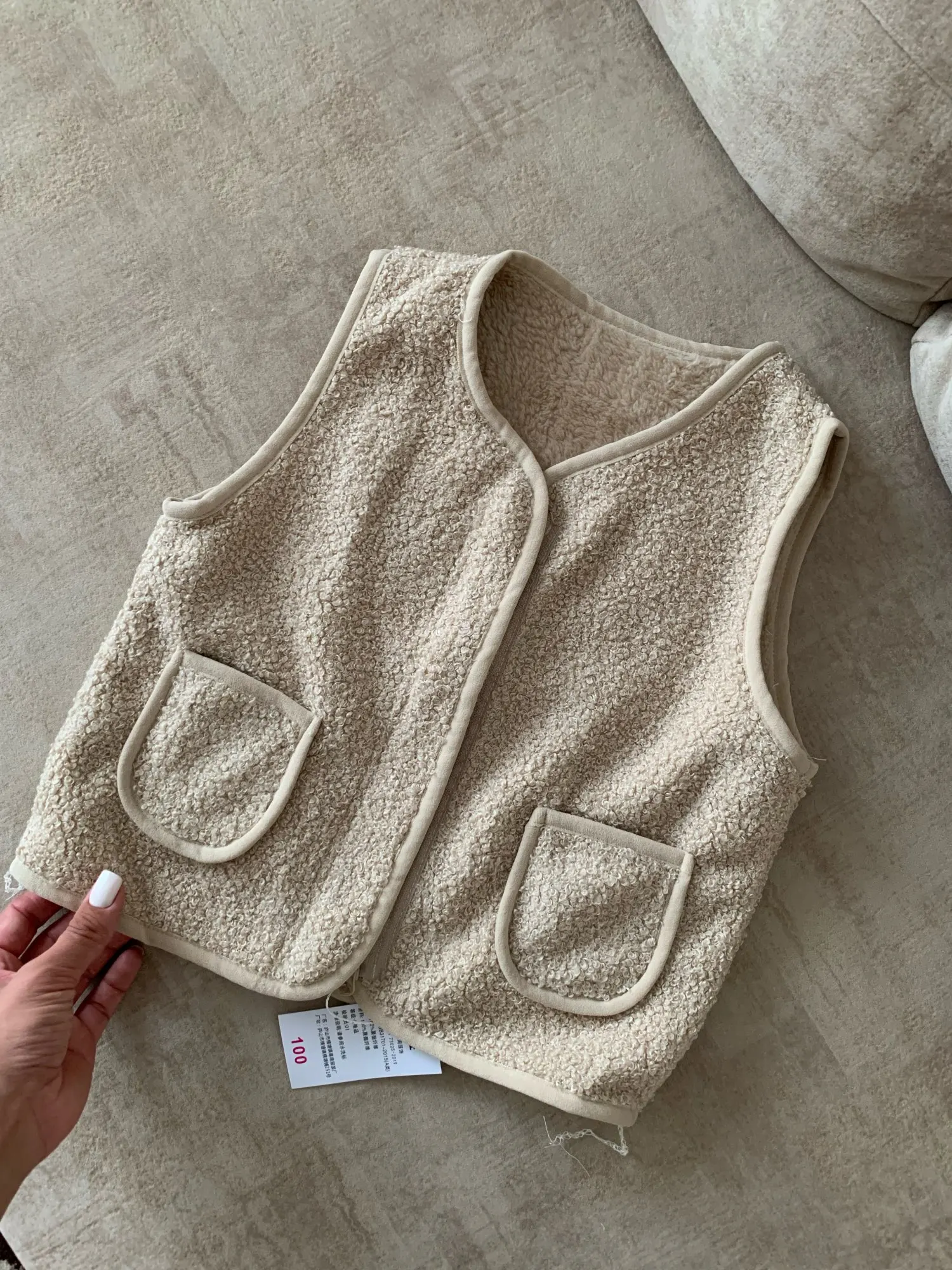 Girls Sherpa Fleece Vest with Faux Fur Lining · Open Front with Front Pocket · 8 Colours · Curly Teddy Outer & Plush Inner · Ages 1 to 7 Years